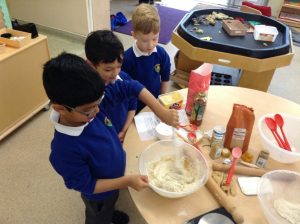 The children washed their hands and rolled up their sleeves before baking. They worked together and were very patient waiting for their turn to weigh out ingredients and then mix them together in the bowl. The children identified how the mixture changed from ingredients to a dough mix. They rolled out the dough before using a gingerbread man cutter to cut out their gingerbread men.
