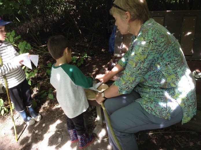 There were additional forest school activities out that the children know well, such as pinecone target shooting, the mud kitchen, and racking and den building. The children showed their grown-ups around the forest school area, showing them the activities they like taking part in. The children had opportunities to take part in all activities available.