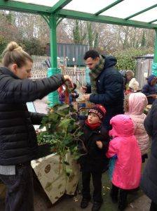 The weather started off cold and icy which provided opportunities to explore properties of ice in the mud kitchen and effects on the leaves and enjoy hot chocolate outdoors at snack time to help keep warm.
