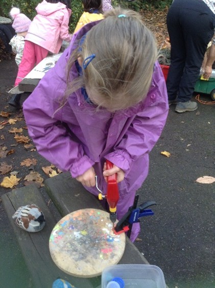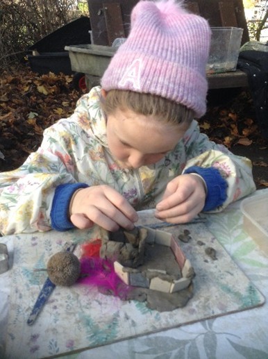 During the term the pupils also revisited favourite activities from past years – such as the mud kitchen, using clay to sculpt with clay, as well as use recycled wood to design props for play whilst continuing to keep themselves safe in the outdoor environment when using equipment and tools (e.g. hammers, peelers, hand drills).