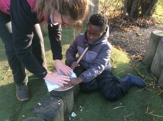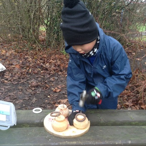 Reception class have continued their weekly sessions with opportunities to revisit favourite activities such as creating in the mud kitchen, bug hunts, and the hammock and also learning new skills in using tools e.g. hammers and mallets, in Hapa Zome and woodwork activities using recycled wood and bottle tops to create their own unique designs.