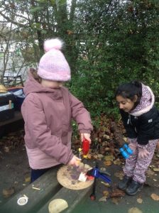 During the term the pupils revisited favourite activities from past years – such as the mud kitchen, using clay to sculpt clay creatures, faces and objects as well as use recycled wood and bottle tops to design props for play whilst continuing to keep themselves safe in the outdoor environment when using equipment and tools (e.g. hammers, peelers, hand drills).