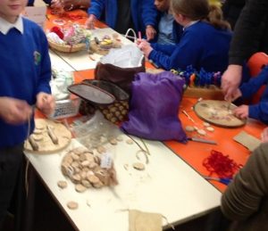 For the second activity, pupils and parents worked with willow withies, harvested from the school grounds, to make their very own Christmas wreath. Ivy, holly, dogwood and rosehips gathered from around the school grounds were added, along with teasels, honesty springs and larch cones. A mix of wool, ribbons, pipe cleaners and beads were used to attach the natural decorations and and personalise each wreath.