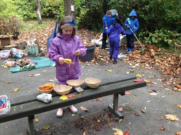 The children explore the seasons and help to keep the wild area safe as the leaves fall in the Autumn. The children have enjoyed using some of the larger tools – rakes and brushes to help clear the leaves from the field area where they play.