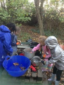 The wet weather has allowed muddy puddles to develop in the wild area and have been places the children have chosen to play, as well as creating their own potions and imaginary food in the mud kitchen area.