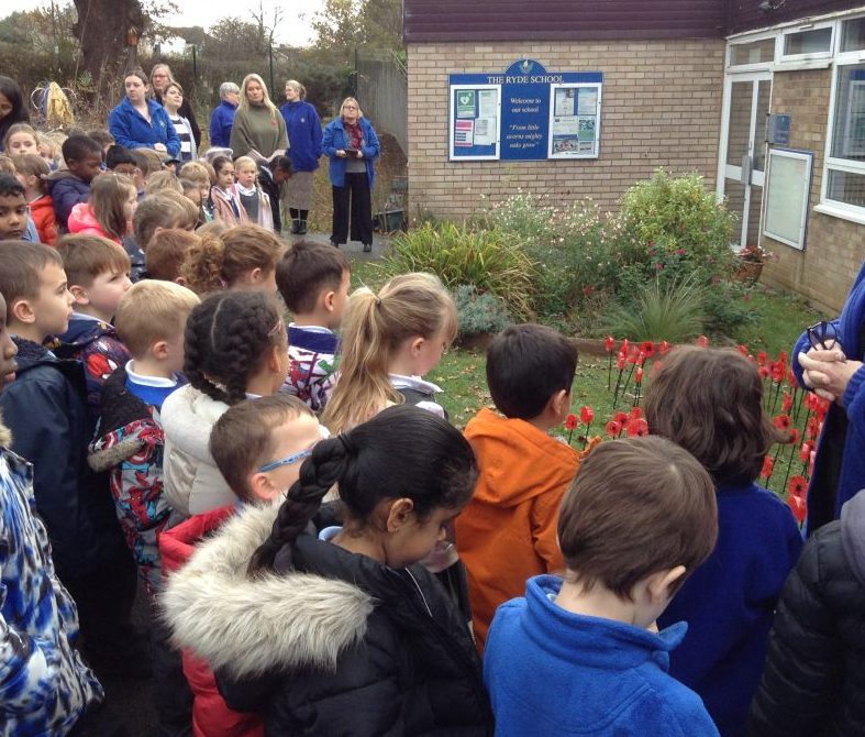 The pupils and staff held their 2 min silence surrounding their very own poppy garden. Every child and staff member made a poppy, from recyclable materials, and then planted them to make a very special place to gather for the silence.